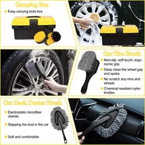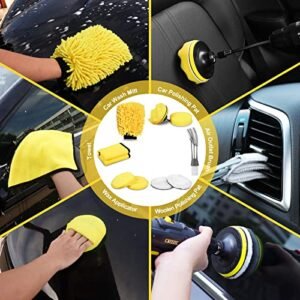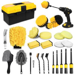 - γValue 27PCS-in-1 Car Detailing KitγOur 27 pcs car detailing kit including car Detailing Drill Brushes*5. Car Detailing Brushes*5. Wire Brushes*3. car dash duster Brush*1. tire brush*1. air outlet brush*1. Car Wash Mitt*1. microfiber wax applicator*2. Car Washing Towel*2. Car Foam Drill Polishing Pads*2. Woolen Polishing Pad*2. Sponge Backer*1. tool box * 1. The car accessories can satisfy your car’s internal and external beauty and cleaning.(Drill not include)