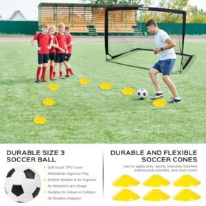 - COMPLETE and VALUABLE KIDS SOCCER GOAL SET: The kids soccer goal net contains almost all soccer accessories. 6×4 ft pop up soccer goals set of 2. 1 std size 3 soccer ball. 1 ball pump with needle. 6 cones. 8 U-shaped metal ground stakes. 1 detachable soccer goal target and 1 carrying bag. Whether you’re honing your soccer skills of shooting accuracy and goalkeeping or organizing a friendly soccer tournament. this portable soccer goals will be the centerpiece of unforgettable moments.