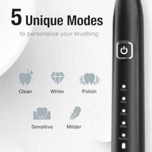 - 5 HIGH-PERFORMANCE BRUSHING MODES- Clean(gentle). White(strong). Polish(strong invert frequency). Milder(gentle invert frequency) and Sensitive(soft) to suit different conditions of teeth of gums. so you can choose different modes according to your preferences and dentist’s recommendations.