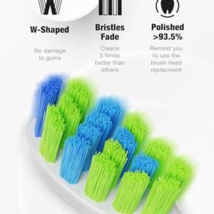 - 6 REPLACEMENT BRUSH HEADS. W SHAPE DESIGN- Comes with 6 replacement brush heads to avoid order new replacement brush heads frequently. W shape design to suit teeth topography for thorough cleaning of gums and hard to reach areas. Notice: Gentle on your gum and blue indicator bristles fade in color to let you know when it’s time to replace the brush head. Each brush head lasts 3 months so 6 will last for about 18 months.