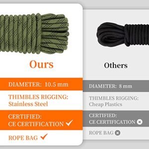 - Rope Details: This climbing rope with two carabiner hooks ends sewed with a strong stainless steel protection thimbles rigging. which provides you safety and reliable. Diameter 10.5 mm. Pull (Max tensile force): 23 KN(5100 lbs). Max Bearing: 1900 kg (4188 lb).