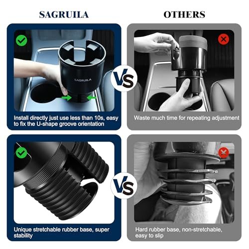 - Cup Holder Expander with Unique Stretchable Rubber Base: Are you tired to adjust the cup holder base repeatedly over and over again? Are you annoyed that you can’t fix the car cup holder expander U-shape slot in the desired position quickly? SAGRUILA car cup holder expander with unique stretchable base is the perfect solution for easy installation. fix the cup holder with screw on the base. then squeezes by one hand in 1S and fixing the cup holder U-shape slot in the position you need quickly