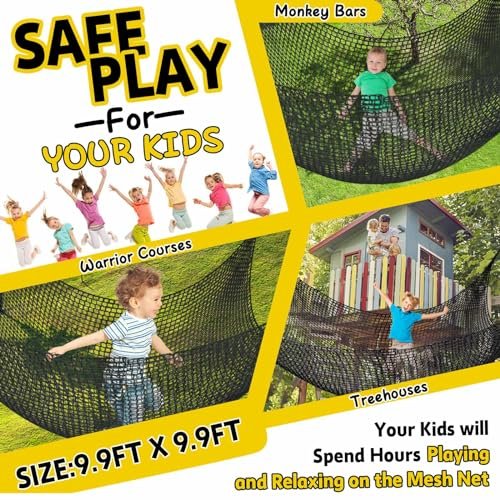 - SAFE PLAY FOR YOUR KIDS: The JumpTrzz kids playground safety net will keep your kids entertained while keeping them safe. The safety net size is 9.9 ft x 9.9 ft. and the mesh size is 1.5 in x 1.5 in. you’ll be able to cover more ground. which makes it perfect for monkey bars; hammocks; swings; playgrounds; treehouses or warrior courses