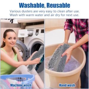 - γRemovable and Washable ChenilleγChenille can be used both drying and wet. suitable for wet and drying dust removal in large areas. and can clean slightly larger gaps.The cleaning cloth and chenille duster head are reusable and machine washable.just put them together and wash them (The microfiber feather duster and window blind duster can only be washed by hand