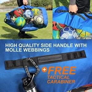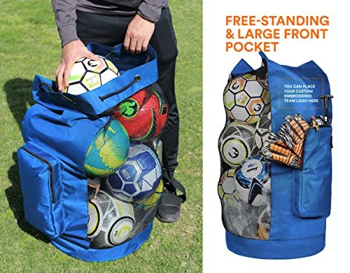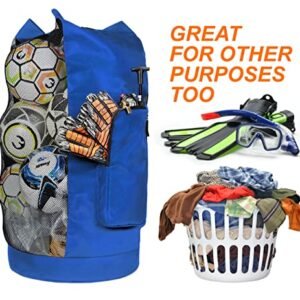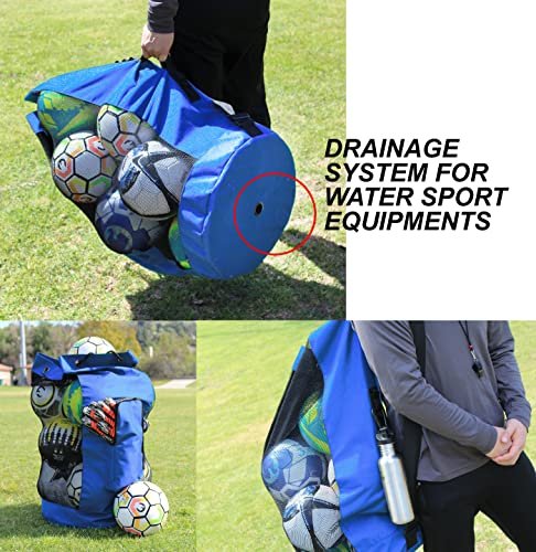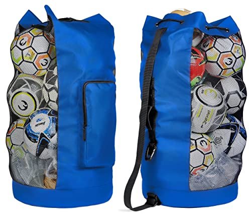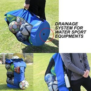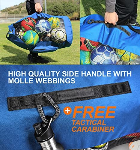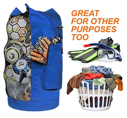 - CARRY ALL YOUR BALLS AND EQUIPMENTS IN ONE BAG – Measuring at 17 inch wide and 36 inch tall. this EXTRA LARGE mesh bag can hold 13+ adult soccer balls. 10 basketball. and scuba gears for the whole family. Never have to worry about not bringing enough equipment because this bag will hold everything. The additional oversized SIDE POCKET is perfect for air pump. stopwatch. whistles and your personal item. It is the one equipment bag you will ever need for all your sports and outdoor events.