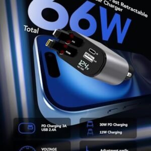 - [All-NEW Retractable Car Charger] The 4 in 1 retractable car charger pulls out the cable within the 80 cm range. Compatible with iPhone car charger includes 2 retractable cable. and it retracts back inside automatically for storage. keeping it clean and tidy without cable entanglement. and car organization facilitating convenient control and usage.