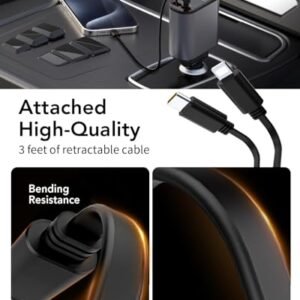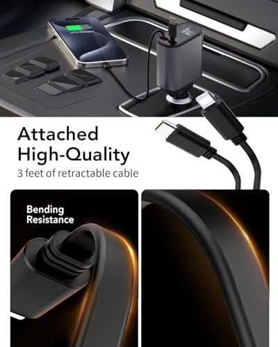 - [Smart Fast Charger-VOLTAGE MONITOR] The retractable car charger ensures that your devices are fast charging efficiently and consistently. Car charger USB C with USB-A and USB-C ports can work with all plug cables. Compatible with iPhone car charger / Car charger USB C is built with overcharging. over current. over-voltage. temperature control. and short circuit protection to protect your device’s battery from overcharge damage.