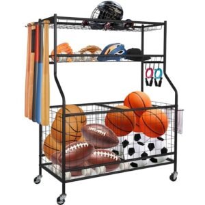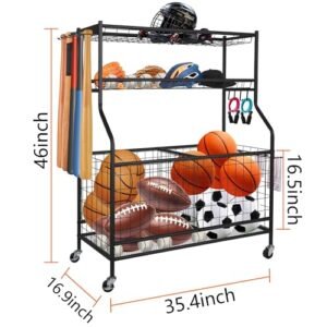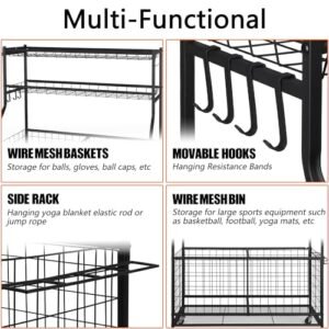 - Multifunctional Sports Storage Rack: This garage sports organizer combines 2 storage bins and 2 metal mesh baskets. Can hold basketballs. soccer balls. baseballs. volleyballs. helmets. and hang baseball bats. towels. Organize and store all your indoor and outdoor sporting goods in storage rack. really gives you space saving storage storage convenience and kid access.