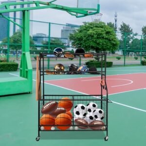 - Suitable for multiple occasions: This outdoor organizer comes with four multi-directional wheels on the bottom that swivel 360Β° for easy movement to any position and Two of the wheels can be locked and used to limit the movement of the organizer in a fixed area. Ensure easy use of the storage rack in garages. basements. sports fields. playgroups. storage rooms. school or outdoor patios. and soccer fields.