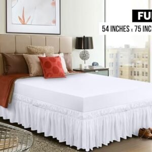 - Full bed ruffle – Full size bed ruffle measuring 54 by 75 inches with a 16 inches drop. ensuring everything under your bed stays hidden